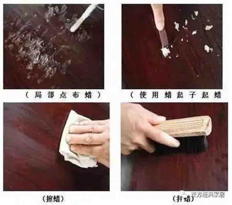 擦蜡:另一种打蜡方式是直接擦蜡,将家具表面打磨光滑后,不烫蜡,直接将蜡擦入家具表面,做法如下面图片所示: