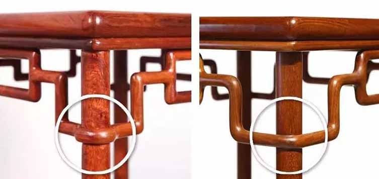 圆包圆造法要用“裹腿枨”。在圆腿家具上,枨子将朝外的棱角倒去,做成混面(圆弧面),两根枨子在转角处相交,四面交圈,枨子表面高出腿足,外貌仿佛是竹制家具用一根竹材煨烤弯成的枨子,因为它将腿足缠裹起来,故得名“裹腿枨”。